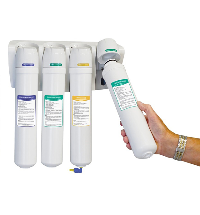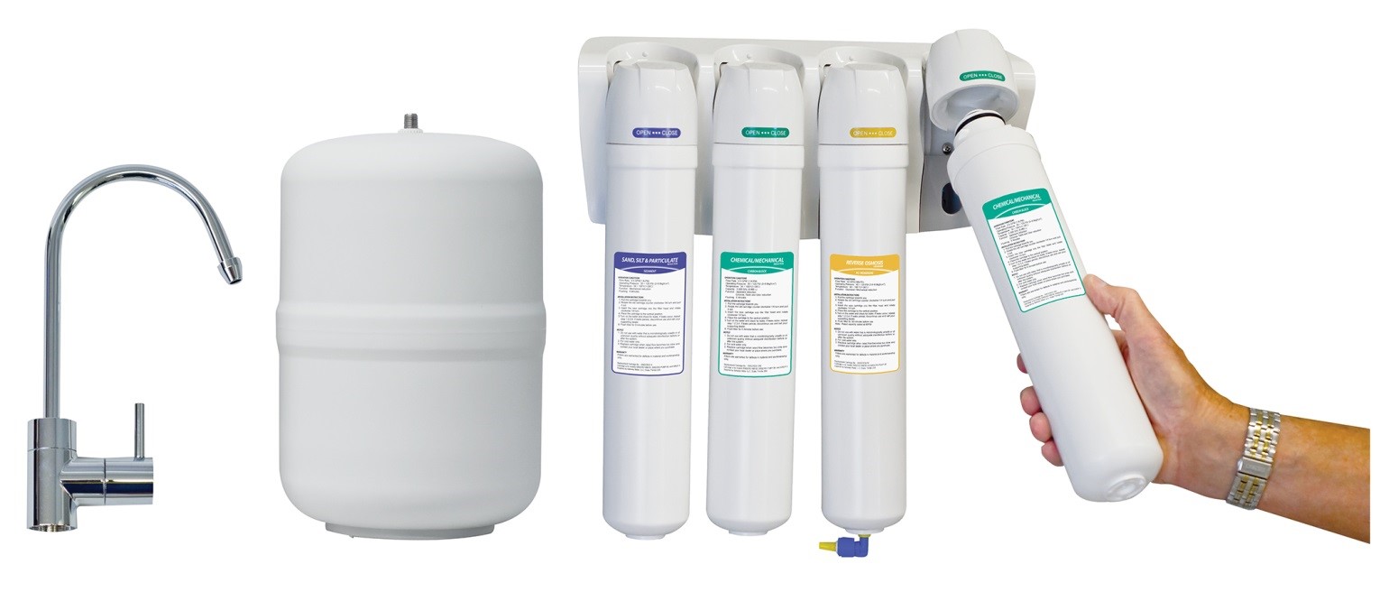 The reverse osmosis process is highly effective, removing more contaminants than any other technology. The process is slow, however, so a storage tank is always required. Typically RO systems are installed under the kitchen sink, and a dedicated faucet is used to supply water produced by the reverse osmosis system.