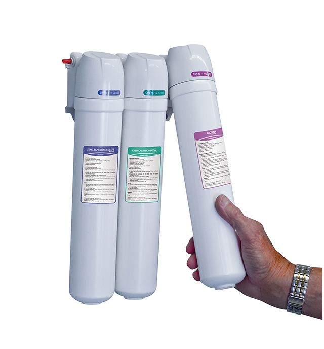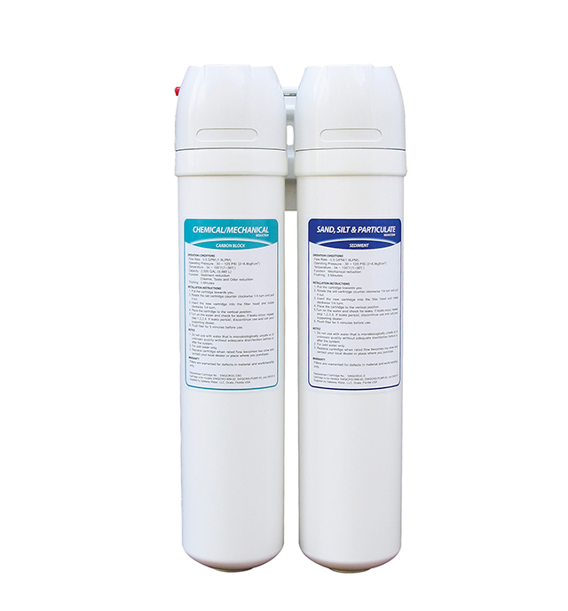 Enjoy great tasting, filtered drinking water with our two-stage under sink system filter designed for city water. System includes two-stage hinged bracket, quick change sediment cartridge, quick change activated carbon cartridge, angle stop valve for feed water, dedicated chrome faucet and tubing. This filter is full-flow, so no storage tank is required.